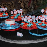 This is a chocolate cake covered in fondant. Decorations are made from fondant, gum paste and assorted candy.