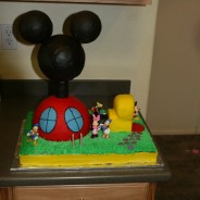 I made this cake for my daughter’s 2nd birthday. All she talked about for about 6 months was Mickey Mouse. I used a sheet cake for the bottom, covered with buttercream “grass” and a fondant fence around the sides. The clubhouse was all styrofoam, covered in fondant…mostly because I didn’t need anymore cake!! ...