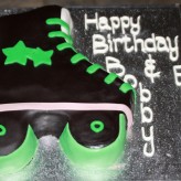 This is a vanilla cake filled with chocolate ganache and covered with a chocolate flavored fondant. Decorations are also made from fondant.